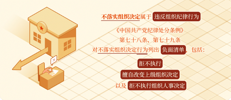 執(zhí)行黨的決定,服從組織分配,積極完成黨的任務(wù)是黨員必須履行的義務(wù)。不落實(shí)組織決定屬于違反組織紀(jì)律行為。《中國(guó)共產(chǎn)黨紀(jì)律處分條例》第七十八條、第七十九條對(duì)不落實(shí)組織決定行為列出負(fù)面清單,作出處分規(guī)定——